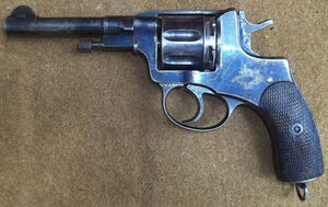 Итак, Наган довольно позднего выпуска (конкретно этот – сороковых годов прошлого века). Калибр 7,62 мм. Ударно-спусковой механизм двойного действия. Боезапас: барабан на семь патронов. Начальная скорость пули: 270 м/с. Прицельная дальность стрельбы – 50 м. Скорострельность: семь выстрелов за 15—20 сек